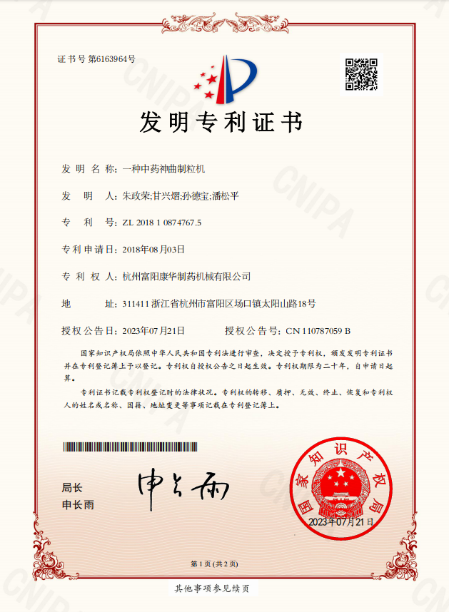 一種中藥神曲制粒機(jī)(發(fā)明專(zhuān)利)喜報(bào)!祝賀我司又獲得一項(xiàng)國(guó)家發(fā)明專(zhuān)利授權(quán)...