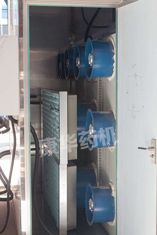 熱泵低溫蒸發(fā)器把流經(jīng)的空氣溫度降至露點(diǎn)溫度以下,使空氣析出水份(冷凝水由排水管排出烘干房外)。絕對溫度降低,再利用熱泵冷凝器加熱空氣,提高空氣溫度,降低相對濕度,產(chǎn)生高溫低濕的干燥空氣,干燥空氣流經(jīng)物料帶走水份再次回到蒸發(fā)器,形成干燥循環(huán),經(jīng)過多次干燥循環(huán)后,完成物料干燥作業(yè)。